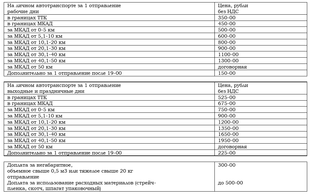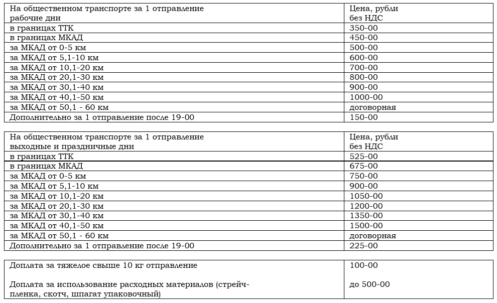 ТАРИФЫ НА ДОСТАВКУ ОТПРАВЛЕНИЙ ПО МОСКВЕ и МО